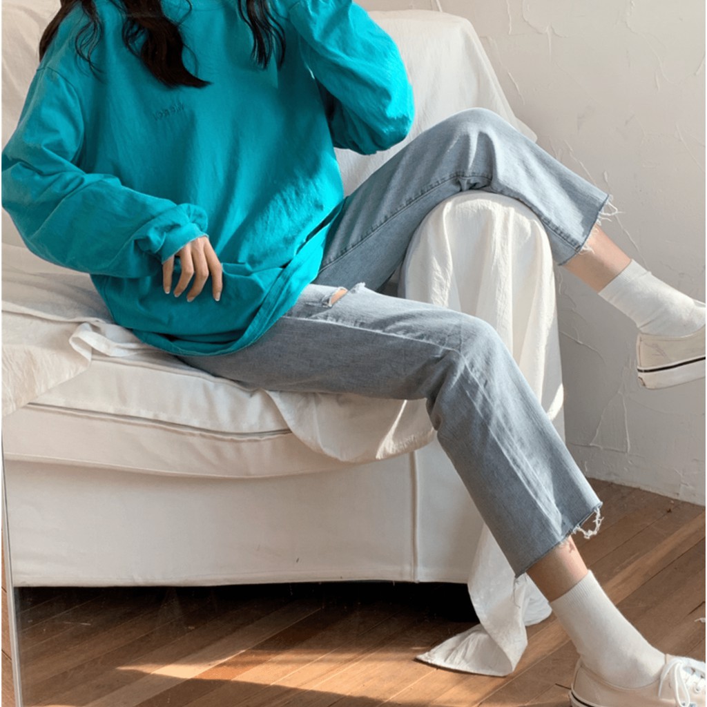 Quần jean baggy xanh nam, nữ ống rộng rách gấu, dáng suông, không phai màu-A04 free ship